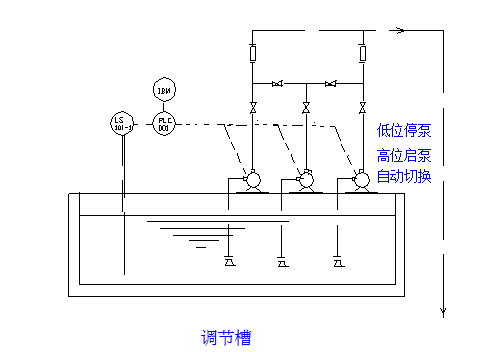 调节池提升泵根据池内液位情况自动启闭:低位停,高位开。启闭控制采用液位自控控制。