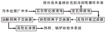 对市政污水厂出水进行深度处理,使其可回用作为电厂循环冷却水系统的补水和锅炉补给水,常用工艺包括石灰澄清软化法、超滤/微滤/MBR 联合反渗透/纳滤法、离子交换法、生化法等[2-3]。由于该污水CODCr、NH3-N、SS 浓度、硬度及碱度都较高,因此,石灰澄清软化是唯一可行的、最经济的预处理办法;高效反渗透技术能有效解决有机物污染和微生物滋生的问题,并且能实现较高的回收率、脱盐率和系统的经济、稳定运行[4]。经过技术经济比较,确定深度处理工艺流程如图1 所示。