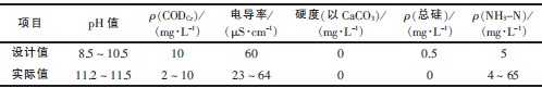 高效反渗透系统产水水质如表3 所示。由表3可知,反渗透系统产水pH 值及NH3-N 浓度比原设计值高,但对将其作为循环冷却水系统的部分补充水及对于后续的锅炉补给水处理系统并没有太大的影响,可以满足生产的需要。