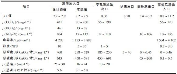 河北某热电厂装备2 台300 MW 亚临界燃煤供热发电机组,使用附近某市政污水处理厂出水作为生产的唯一水源,由于该污水处理厂进水水质经常超标,其中进水CODCr的质量浓度最高达到800 ~1 200 mg/L,远超过设计进水水质要求,因此,其回用至电厂的中水水质也远远超出原设计的二级处理出水水质标准。针对该市政污水处理厂出水的CODCr、SS 浓度及硅含量都比较高的特点,采用石灰澄清软化-过滤-树脂软化-高效反渗透组合深度处理工艺,处理出水满足设计要求,回收率较高,实现了系统的长期稳定运行。高效反渗透专利技术[1]在国外已有工程应用,但在国内将其应用到市政污水的处理回用工程尚属首次。