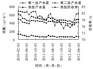 从2010 年1 月到2012 年6 月,系统经历了3次化学清洗,系统通量得到了一定程度的恢复,从2010 年1 月至7 月,系统的出力下降很快,这主要是因为来水水质剧烈波动,使得进入反渗透系统的污水浊度和硬度偶尔超标,反渗透膜受到一定程度的污染,在3 a的运行时间里,系统的出力总体来说比较稳定,系统的产水量从最初的630 m3/h降低到486.8 m3/h,系统的回收率一直维持在75%以上。