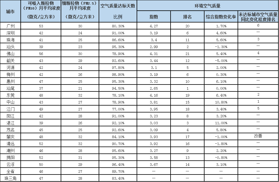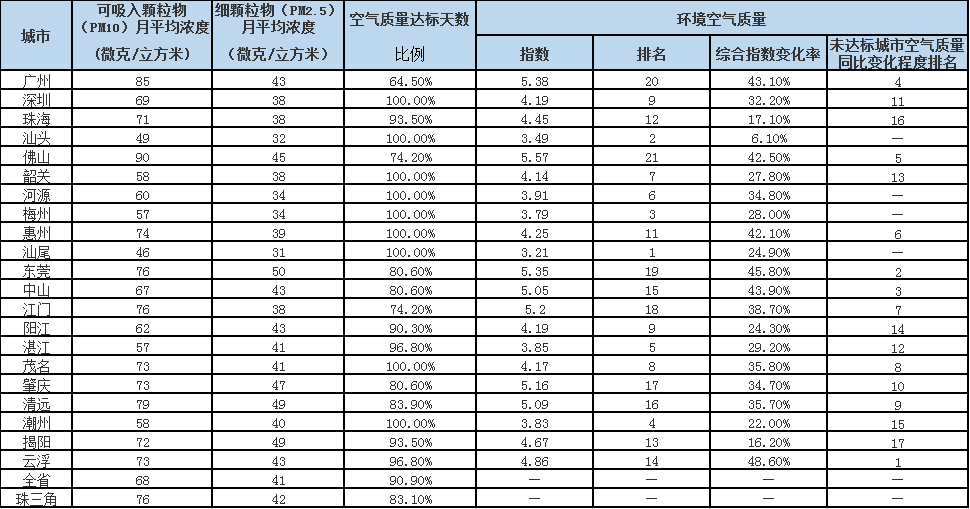 广东省城市空气和水环境质量及排名情况
