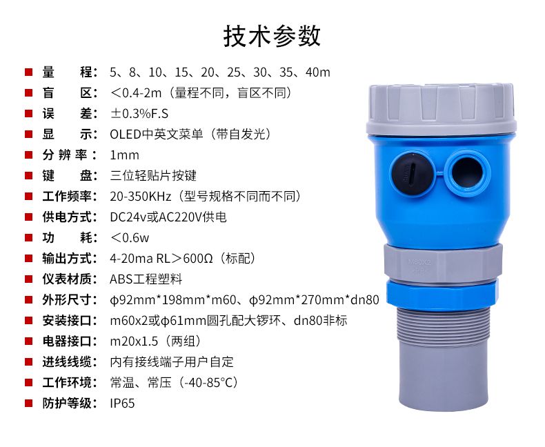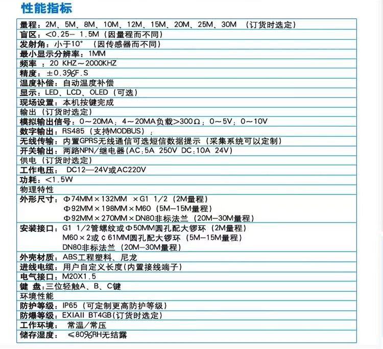 | 探头材质 | 全范普通防水ABS / 耐腐蚀ETFE / 也可定制聚四氟乙烯PTFE探头 |