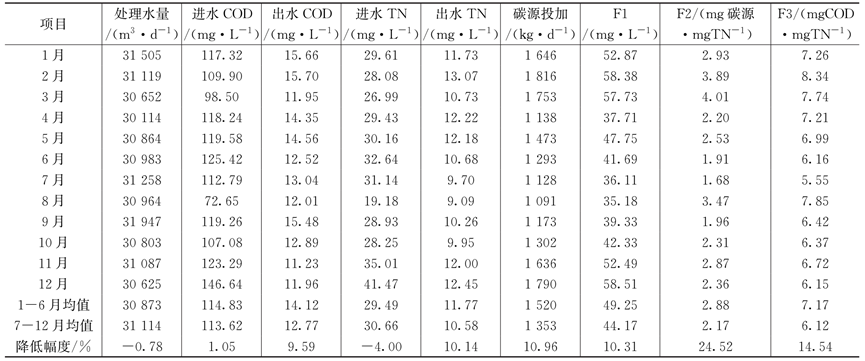 通过表2可以看出,全年日处理水量整体波动不大,但TN水质对碳源投加量影响较大,呈现夏季低冬季高的趋势,投加量由35mg/L升高至60mg/L左右。系统投入后在夏季水质较低时保持较低投加量,冬季TN浓度大幅提升后及时调控提高碳源投加浓度,保证出水TN达标。综合三项指标均降幅在10%以上,但吨水投加及单位污染物削减指标未考虑水质波动变化时对碳源投加影响,C/N指数综合了两个因素影响,更客观反映水质波动时控制效果,但该指数需要较多数值计算略复杂,现场难以第一时间直观反应。