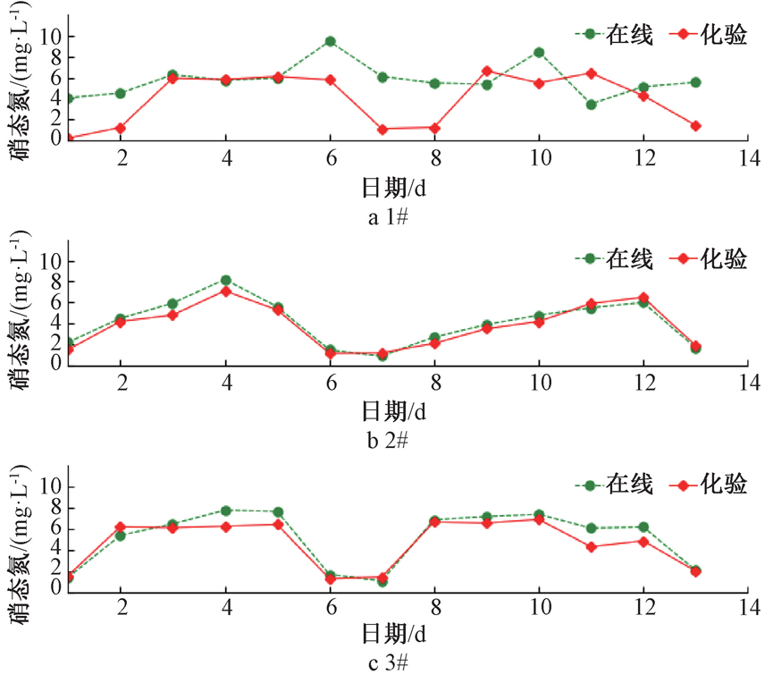 该系统的核心过程仪表为NO-3在线仪表,目前主流仪表类型为离子电极法与紫外双吸收法,选择离子电极1#,紫外双吸收2#:0~25mg/L、3#0~50mg/L进行实际工况测试。