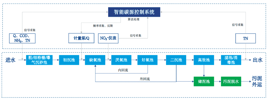 随着水环境质量要求提高,对污水处理厂总氮(TN)的排放加大监管力度,TN控制及去除受到来水水质波动等影响调控参数较多,同时污水处理厂普遍存在进水C/N比较低情况,反硝化所需内碳源不足,为达到稳定排放,需投加外碳源,通常投加成本超过0.15 元/m³H2O,对日常运行及成本控制造成较大压力。水厂碳源投加主要有三种方式,分别为恒量投加、手动调节、自动投加:恒量投加在出水TN不超标情况下基本不做调整,投加量较大;手动调节一般根据出水TN仪表(2 h/次)进行调整加药量,具有较大的滞后性,经常超量或欠投,出水TN不稳定,常面临超标风险;自动投加一般根据时序控制、高级算法等,较为流行的根据神经网络构建的预测投加等,实际应用中受到水质波动等影响持续稳定控制需进一步加强。因此需要开发一种智能化投加方式,易于操控及实施,可提高出水的稳定性,降低投加成本,同时提高运行管理精细化。