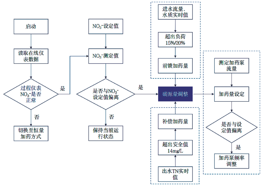 (2)反馈控制:根据模型复算得到NO-3设定值,与实际运行值偏差,反馈输出计量泵流量,进而调节计量泵频率;