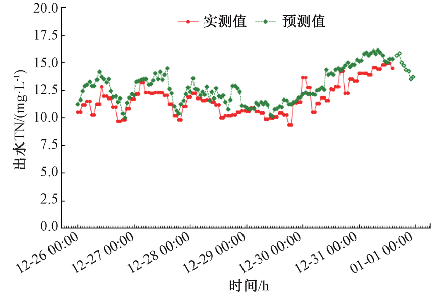 根据本厂各工艺段停留时间进行校核,进水至缺氧末实际停留时间为3h,至出水为10h,因此TN值表观为采集0时进水仪表的NH3生成NO-3值与3时缺氧池在线NO-3值之和。因此,根据上述原理绘制TN的预测曲线,如下图6所示,可提前7h得到TN的预测值,与实际出水值比较,曲线规律基本一致,保障了运行的稳定性和风险可控性,当进水水质大幅高于设定值风险较大时,提前采取措施使得达标排放。与算法预测相比,通过模型建立的预测曲线更切合现场实际运行,不需要大量的数据进行训练。但同时,要对进水仪表、过程仪表等定期维护保证数据的可靠性,方可保证预测曲线的准确性。