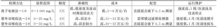 一般缺氧池中NO-3浓度根据进水TN浓度及排放标准控制在0~10mg/L,从上图可以看出1#仪表高浓度时接近实测值,但低浓度时表现误差较大主要为阴离子如Cl-、SO2-4等离子干扰。2#、3#仪表在线数值与化验值波动基本一致,误差在可控范围1~2 mg/L,低浓度下与测量值接近,稳定性较好。综合对比如下表1,根据上表中综合分析,2#、3#成本较高,但系统控制准确度要求0~2mg/L以内且能稳定反应池中浓度变化,维护量较小,因此选择紫外双吸收法仪表。本工程示范中采用2#、3#仪表投入运行。
